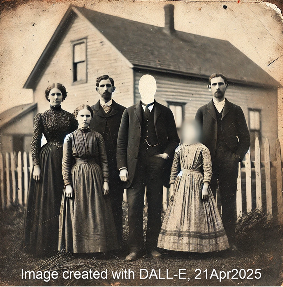 I took two of Steve Little’s Artificial Intelligence classes given at the National Genealogical Society and his course AI Genealogy Seminars: From Basics to Breakthroughs at the Genealogical Research Institute of Pittsburgh (GRIP) (wow! Highly recommend all of them). During the latter, Steve was showing us his custom chat Photo Analyst, and we used a photo I had of Grandpa with his siblings, parents, and grandfather. Steve asked me if the photo showed three generations or four and I suddenly had a light bulb moment.
