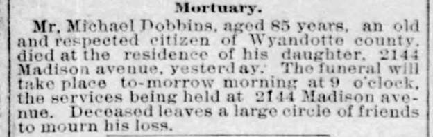 What prompted me to think of this was a to-do list item which unfortunately was only in my head until now. Michael DOBBINS and his wife Mary MALONE were an Irish couple with several children. The family emigrated bit by bit during An Gorta Mór (The Great Hunger). They settled in Morris County, New Jersey for a time, where at least two daughters married and settled, and then the parents and younger children moved out to Shawnee, Wyandotte, Kansas, to farm. Numerous census schedules show Michael engaged in farming and with a considerable amount of land.