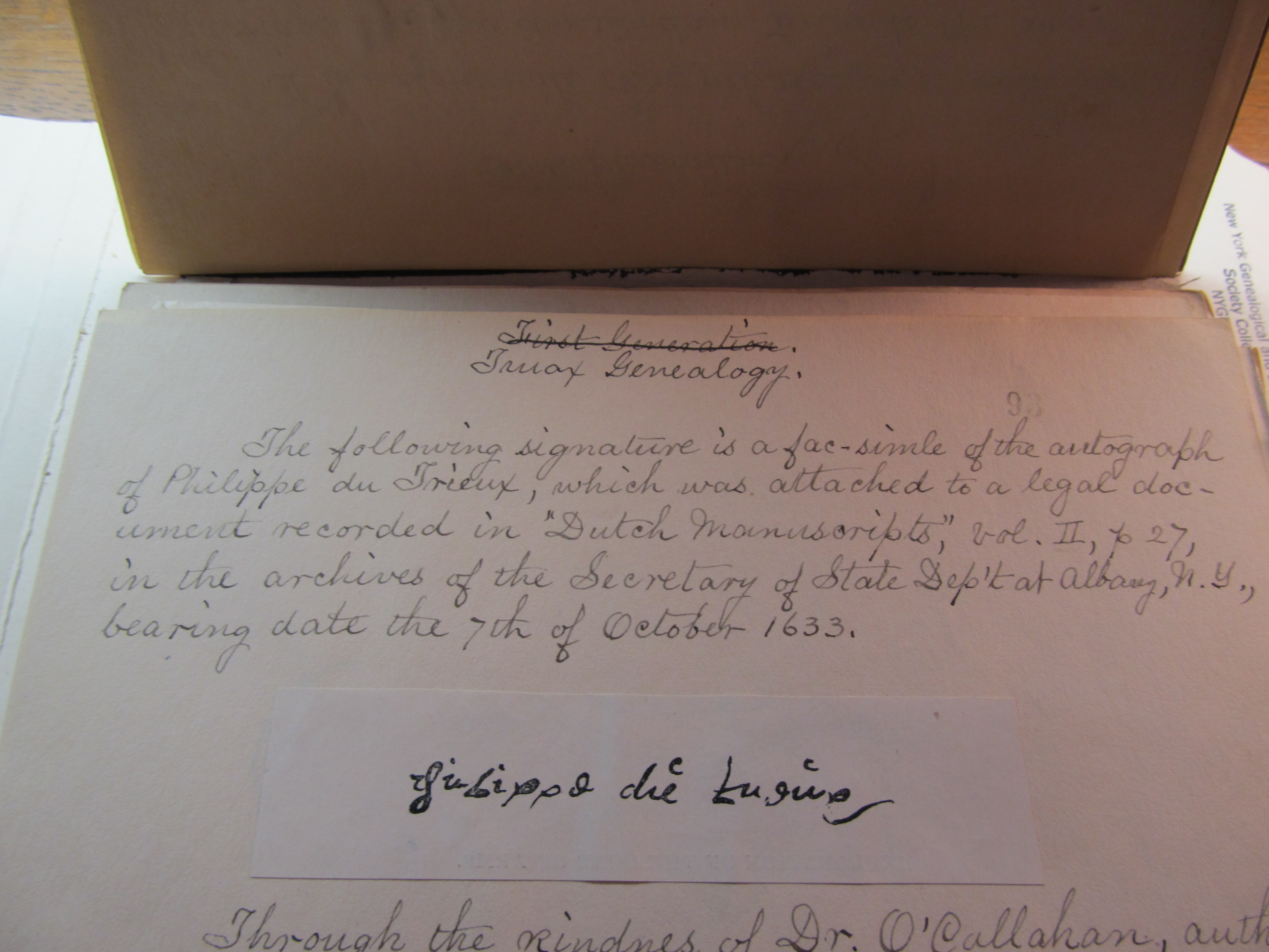 The following signature is a fac-simile of the autograph of Philippe du Trieux, which was attached to a legal document recorded in “Dutch Manuscripts,” Vol. II, p 27, in the archives of the Secretary of State Dep’t at Albany, N. Y., bearing date the 7th of October 1633.