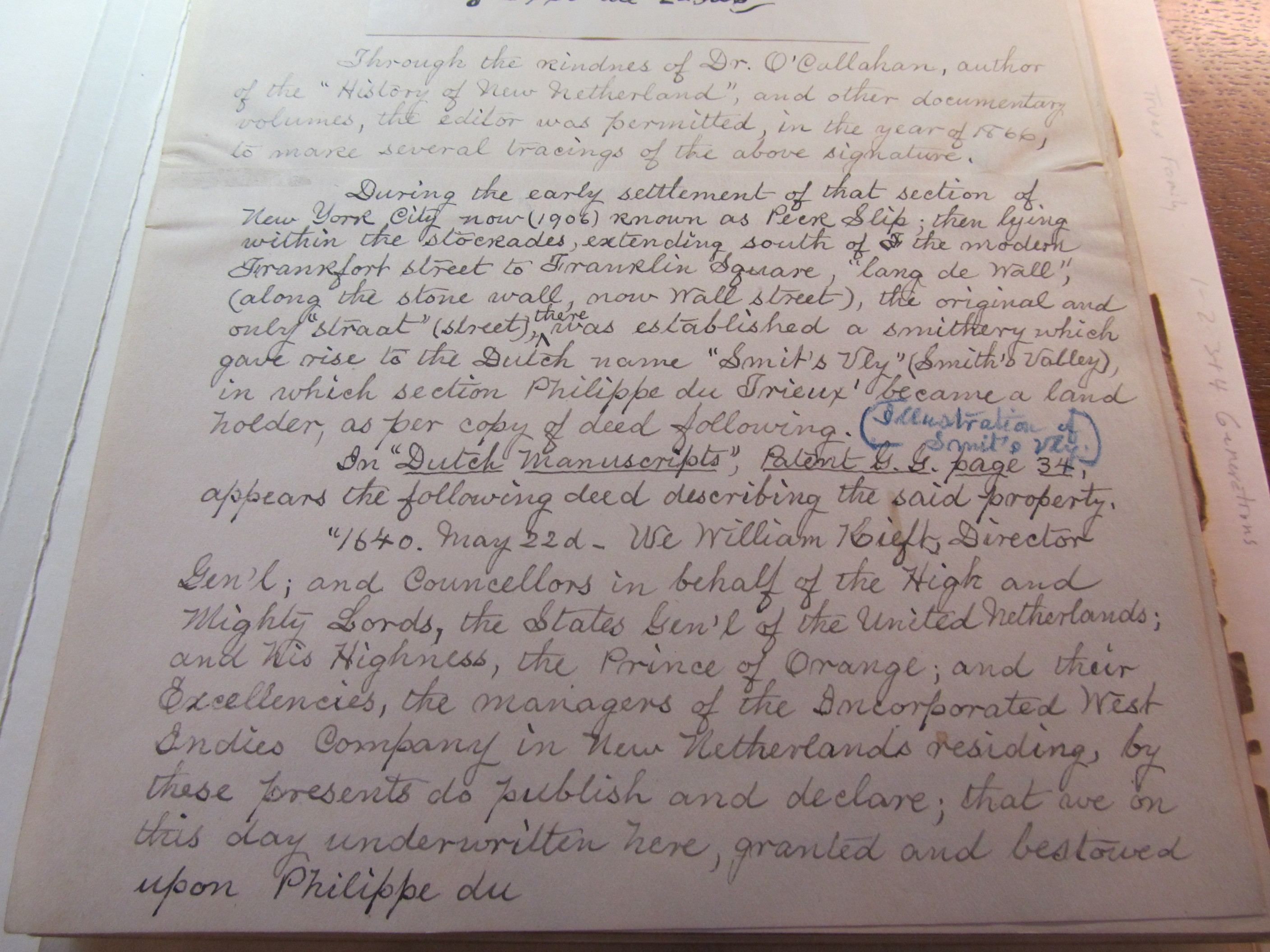 During the early settlement of that section of New York City now (1906) known as Peck Slip, then lying within the stockades, extending south of the modern Frankfort street to Franklin Square, “lang de Wall”, (along the stone wall, now Wall Street), the original and only “straat” (street), there was  established a smithery which gave rise to the Dutch name “Smit’s Vly” (Smith’s Valley), in which section Philippe du Trieux became a land holder, as per copy of deed following/