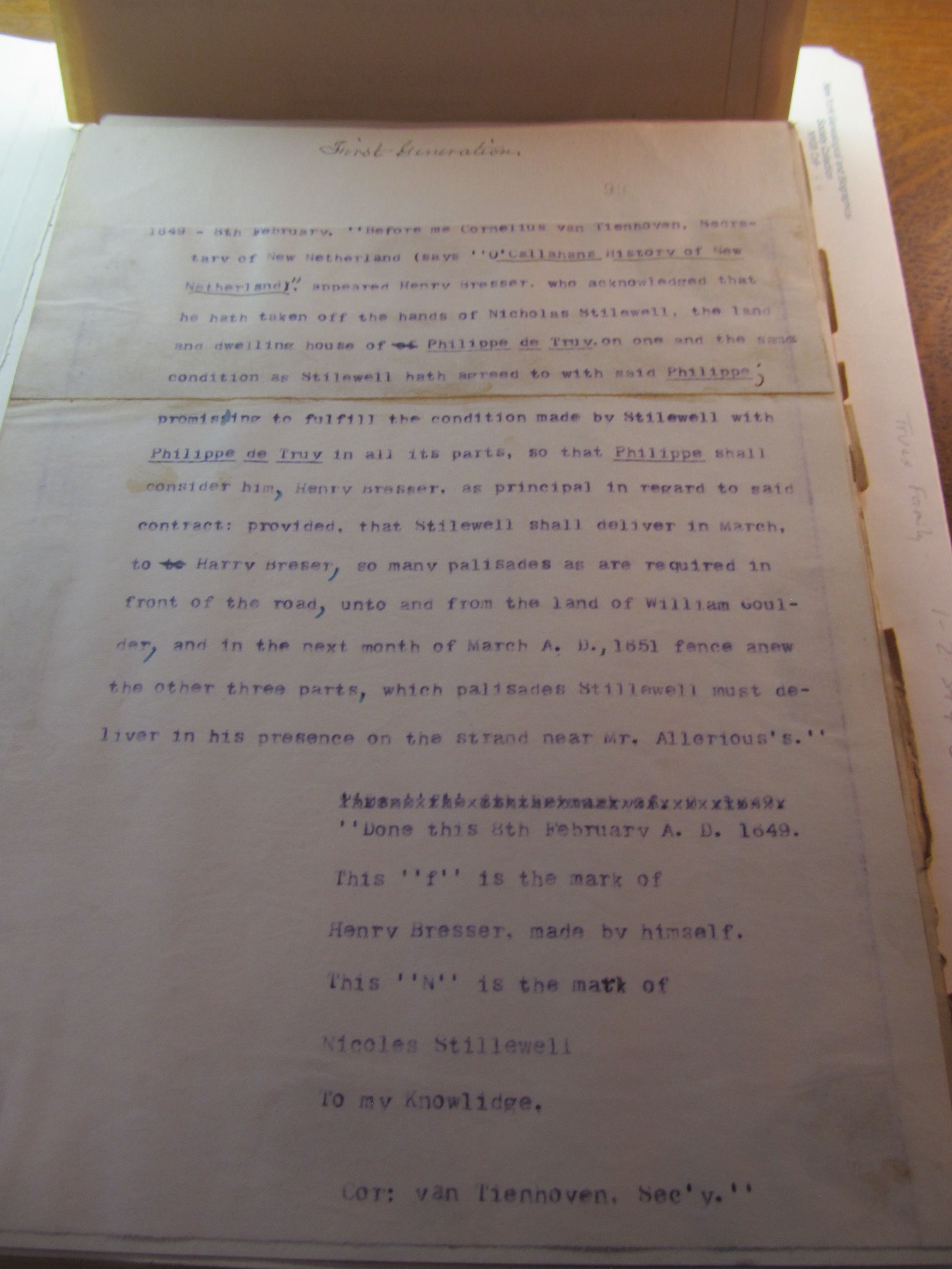 1649 – 8th February. “Before me Cornelius van Tienhoven, Secretary of New Netherland (says “O’Callahans History of New Netherland”) appeared Henry Bresser, who acknowledged that he hath taken off the hands of Nicholas Stilewell, the land and dwelling house of Philippe de Truy, on one and the same condition as Stilewell hath agreed to with said Philippe; promising to fulfill the condition made by Stilewell with Philippe de Truy in all its parts, so that Philippe shall consider him, Henry Bresser, as principal in regard to said contract: provided, that Stilwell shall deliver in March, to Harry Breser, so many palisades as are required in front of the road, unto and from the land of William Goulder, and in the next month of March A. D., 1651 fence anew the other three parts, which palisades Stillewell must deliver in his presence on the strand near Mr. Allerious’s.”