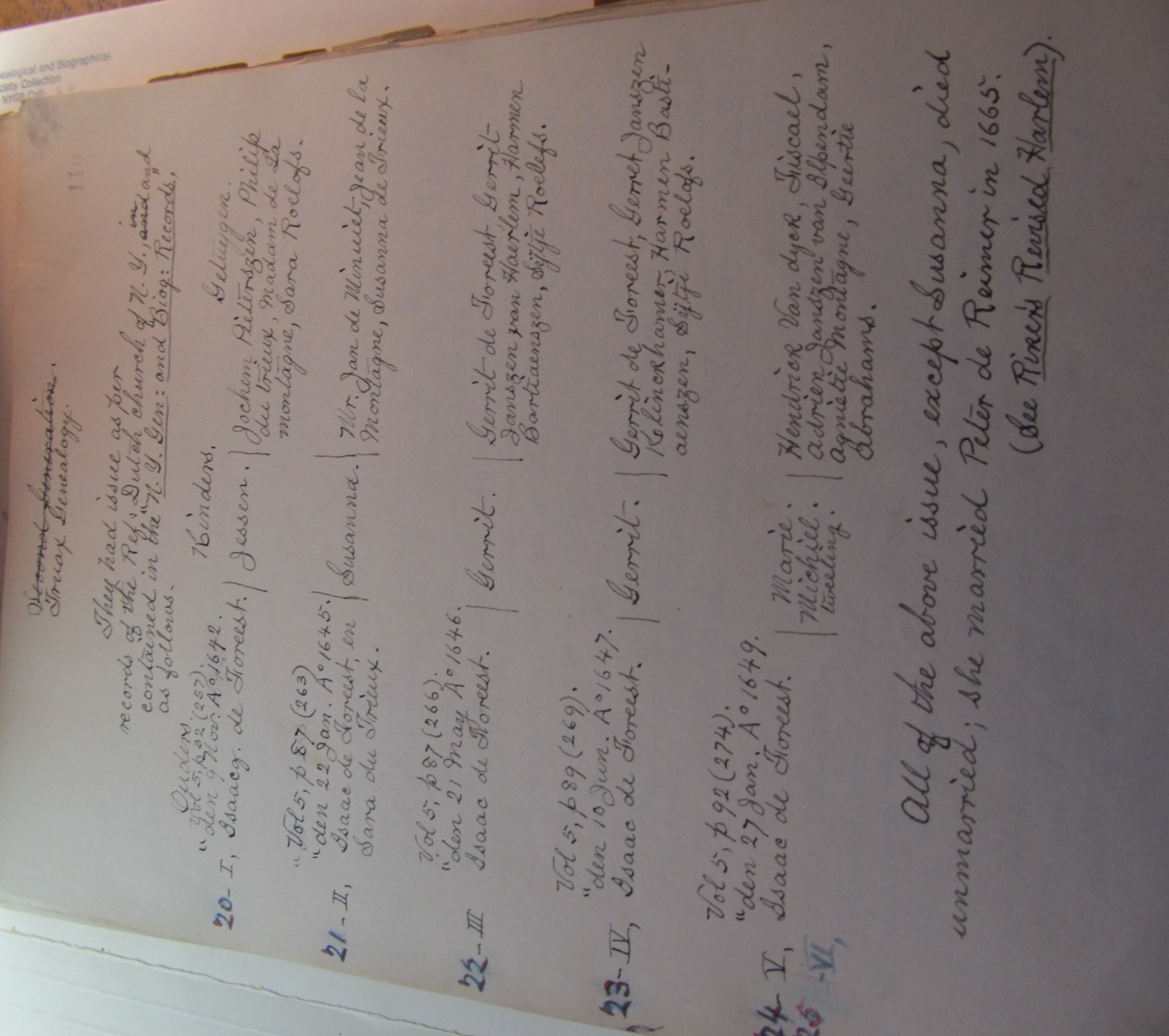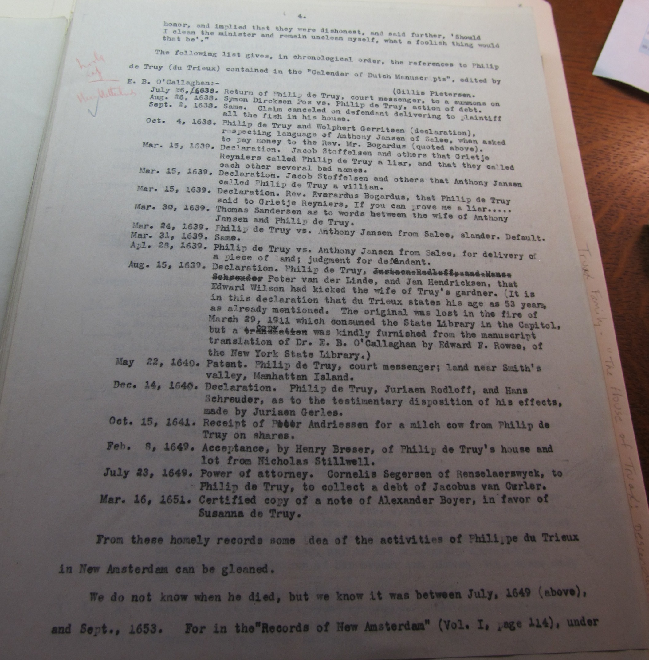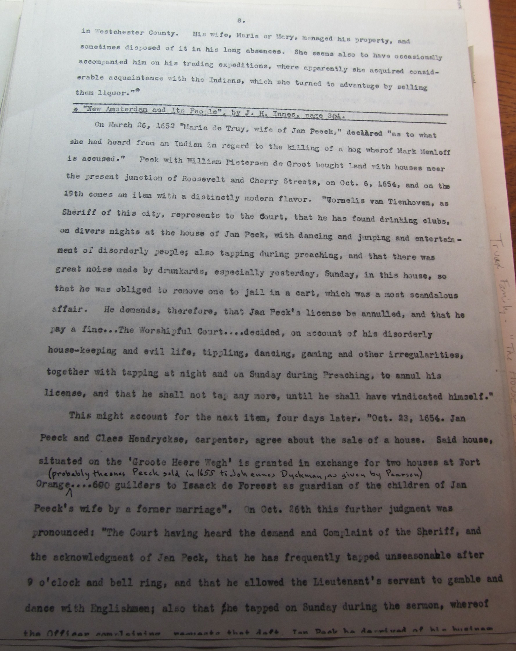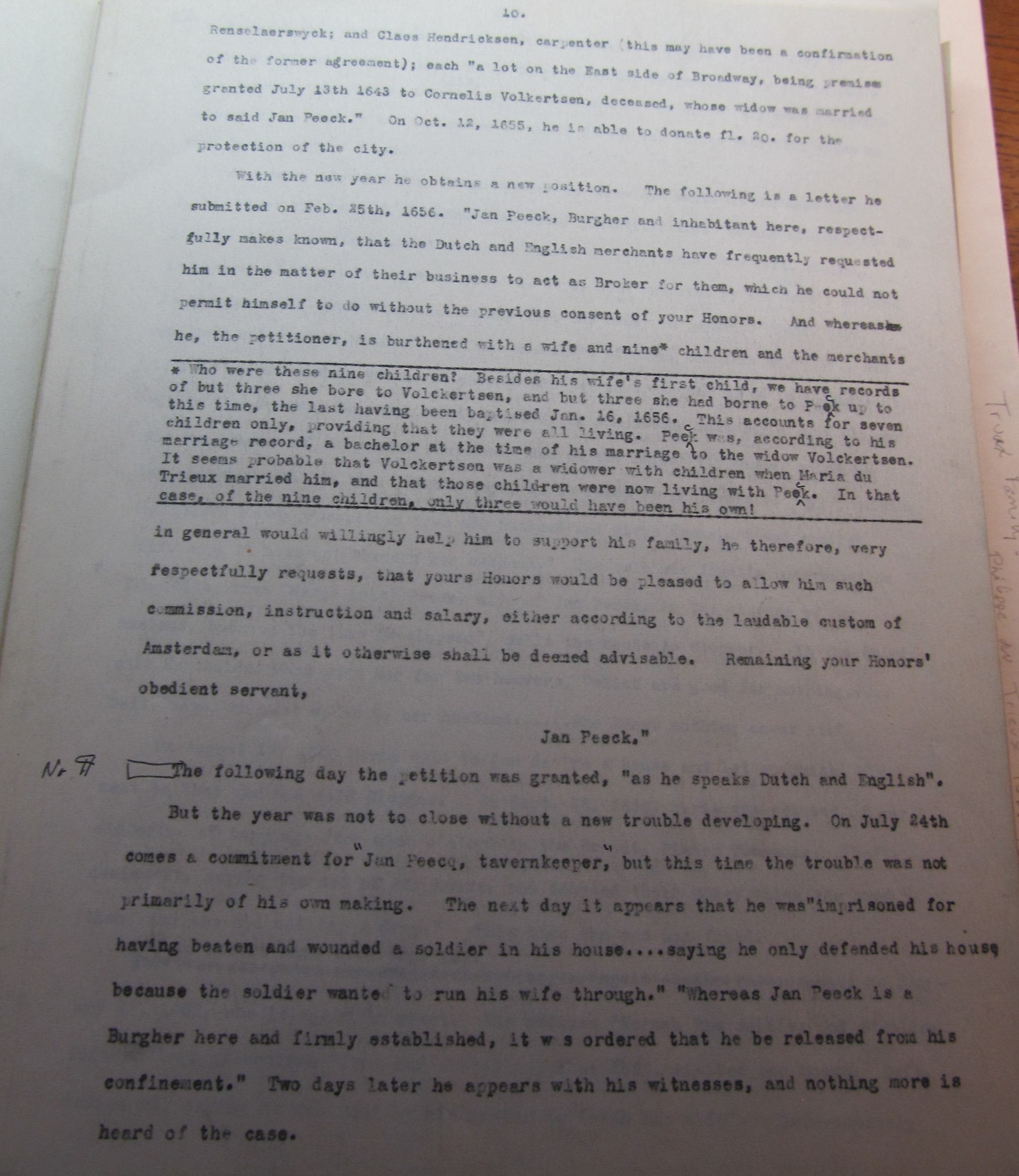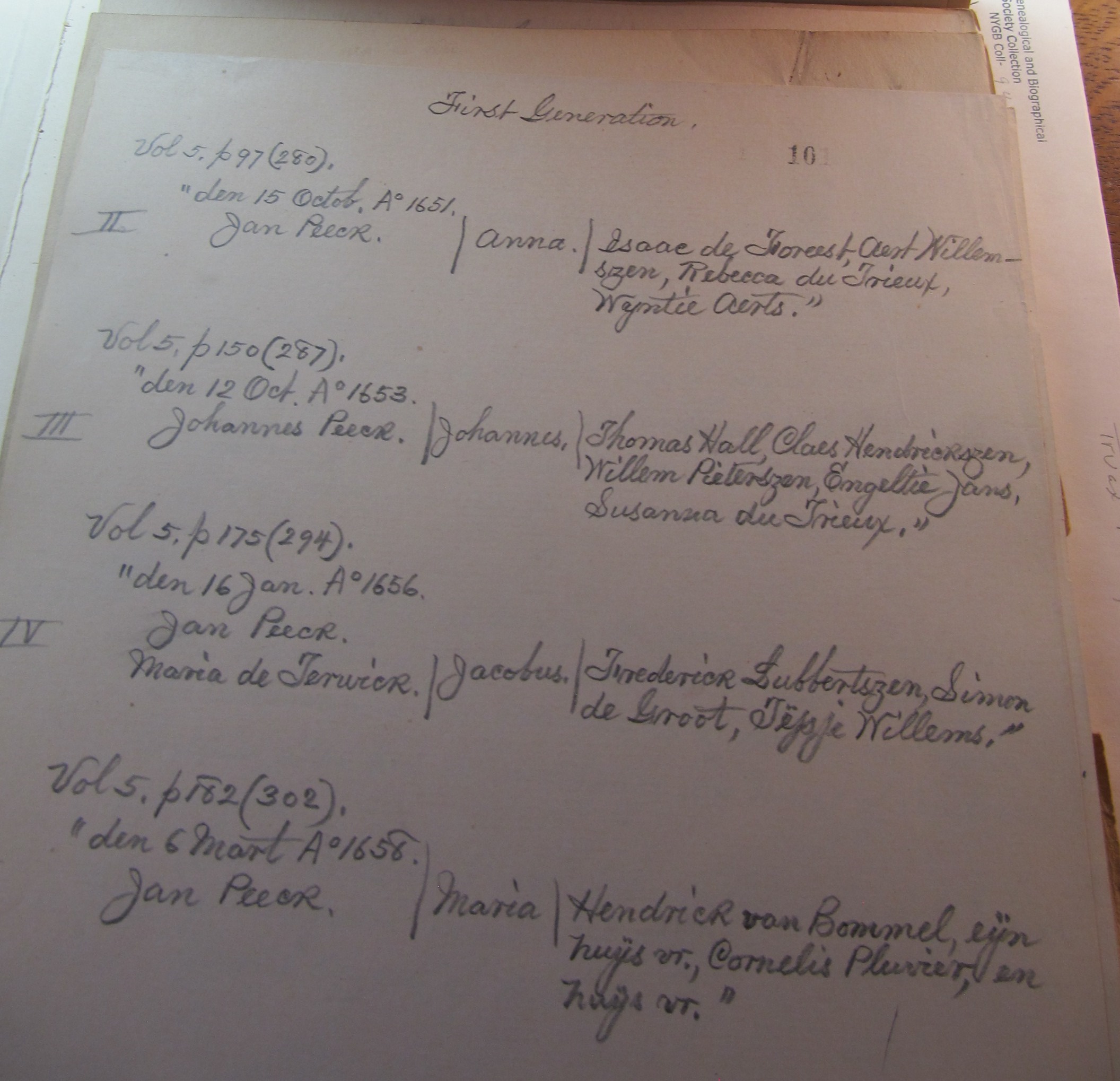 1. Nov. 9. “Maria de Truwe def’t in action. On the petition of Mary de Truy ordered:- Petitioner is referred to Govert Loockermans and Isaack de Foreest, guardians of the minor children. Signed “Mary de Truwe, wife of Jan Peeck.” (See records of “New Amsterdam” Vol I, p 261. Also for other matters, see pp. 265, 268, 270 and 272. Ibid, Vol III, pp 168 and 409. Ibid, Vol IV, p 343 and Vol II p 184).