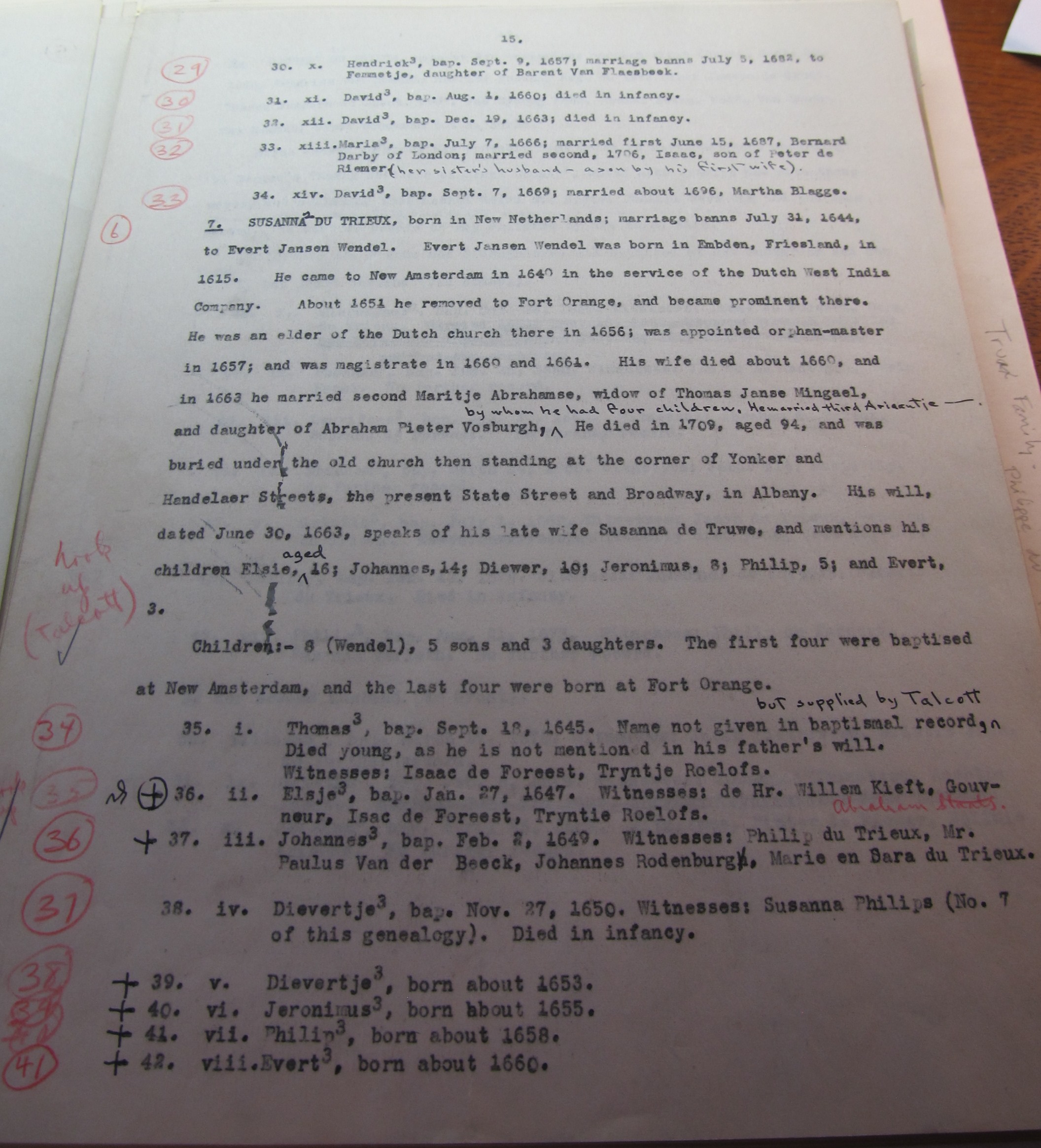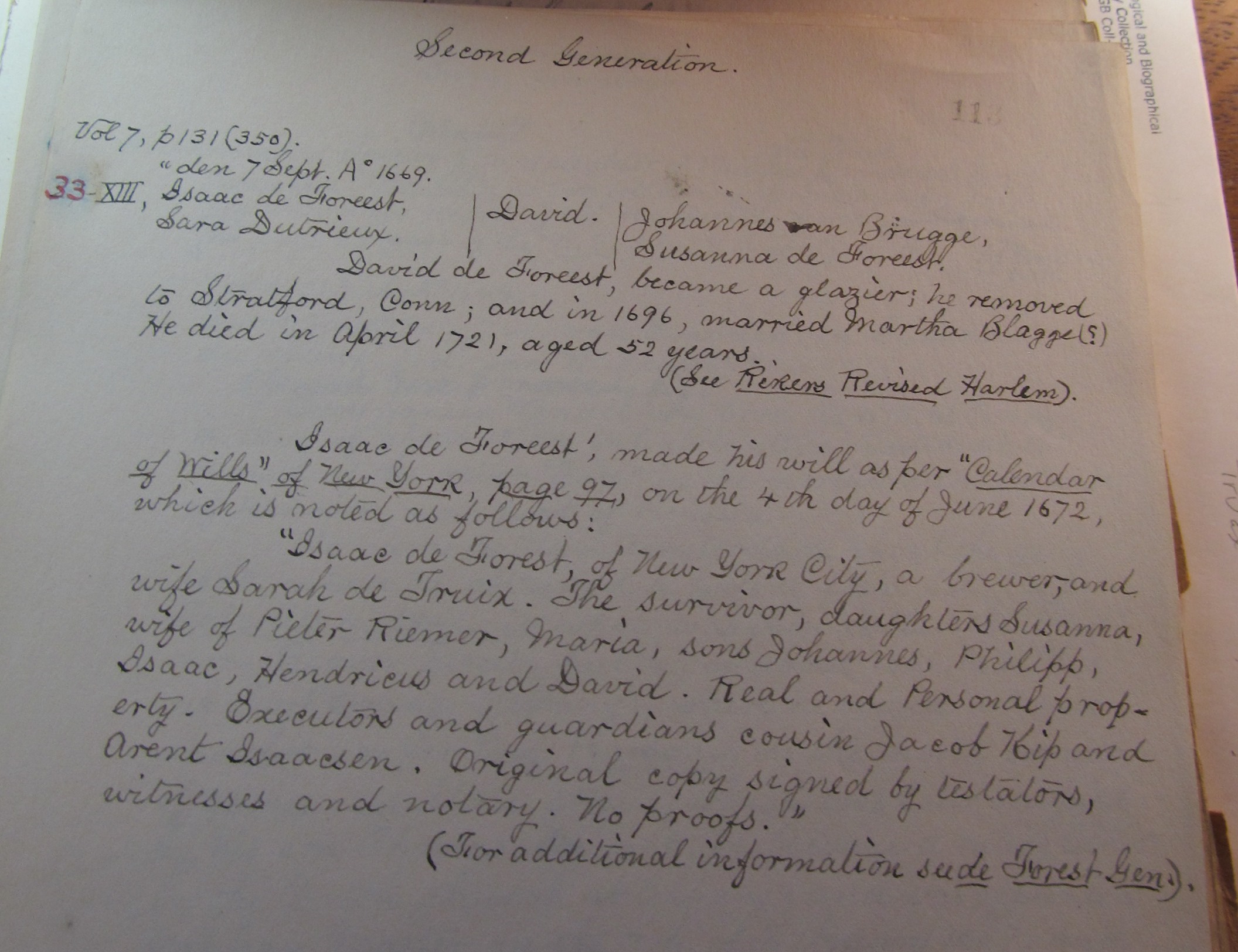 “Isaac de Forest, of New York City, a brewer, and wife Sarah de Truix. The survivor, daughters Susanna, wife of Pieter Riemer, Maria, sons Johannes, Philipp, Isaac, Hendricus and David. Real and Personal property. Executors and guardians cousin Jacob Kip and Arent Isaacsen. Original copy signed by tesators, witnesses and notary. No proofs.” (For additional information see de Forest Gen.)