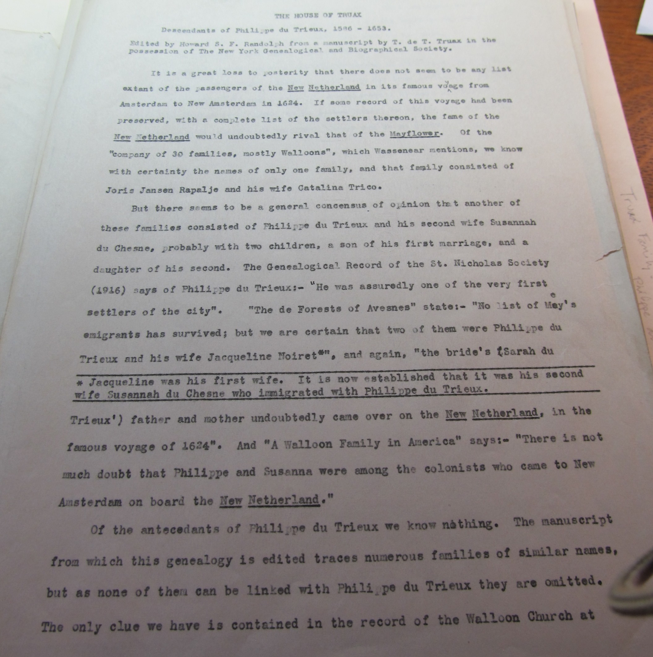 Truax, T. de T., House of Truax. “Bien faire et ne rien craindre.” Historical Genealogy of the Truax-Truex Families of the United States and Canada, descendants of Philippe de Trieux, the first Huguenot-Knickerbocker of that name who settled in New Netherland in 16__ and embracing his posterity to the present date a period of nearly three centuries of Twelve Generations. Manuscript. From New York Public Library, Call No. NYGB Coll-94 Box 1 and Box 2. http://catalog.nypl.org/record=b18209329~S1 . (Accessed 18Jul2015)