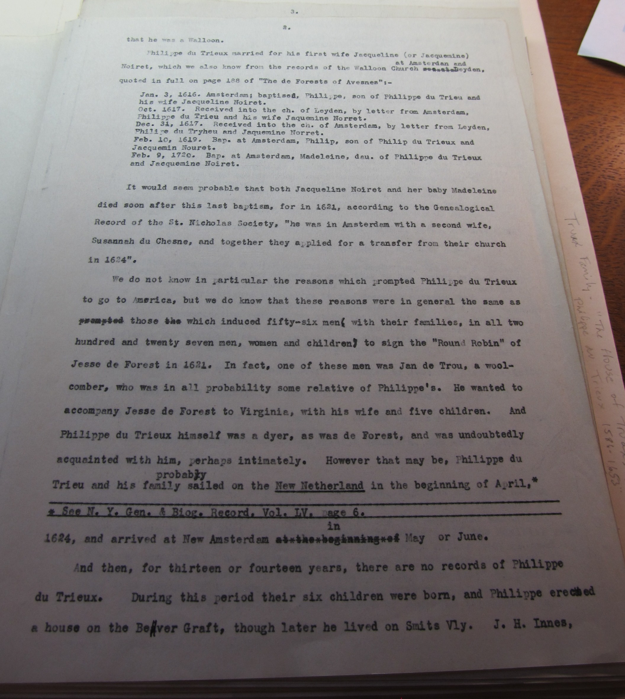 1. Sara2 du Trieux, born in New Netherlands, as distinctly stated in her marriage banns. These banns were published on June 9, 1641, to “Isaacq de Foreest, j. m. Van Leyden”. Isaac de Forest was baptized at Leyden, Holland, July 10, 1616, and was a son of Jesse de Forest. The probable friendship of these two families in Holland has already been discussed. Isaac de Forest had immigrated with his brother Hendrick and his sister Rachel in the Rensselaerswyck, which sailed from Amsterdam on Sept. 25, 1636, and arrived at New Amsterdam March 5, 1637, after many delays. This family has been so fully written in “A Walloon Family in America” that it is only necessary to give an outline of it here. It would seem that Isaac de Forest had been a staunch friend of Maria Peeck through all her many vicissitudes. He was one of the witnesses at the baptism of her illegitimate child in 1640, a year before his marriage to her sister. He was the guardian of her minor children on her second marriage, and she constantly went to him for aid. He died in 1674. His widow, Sara du Trieux, or Sara Philips, as she was sometimes called, died on November 9, 1692.