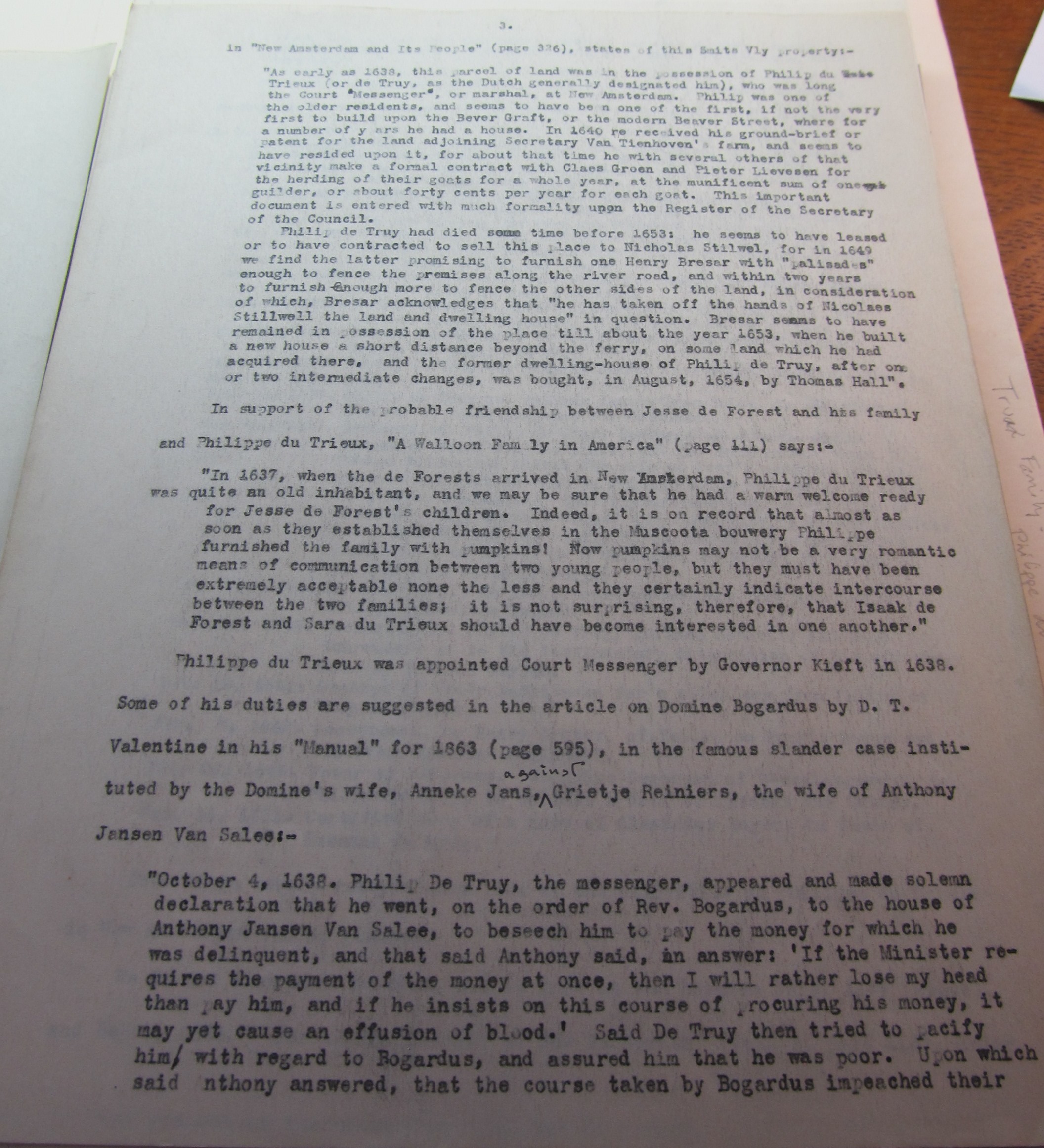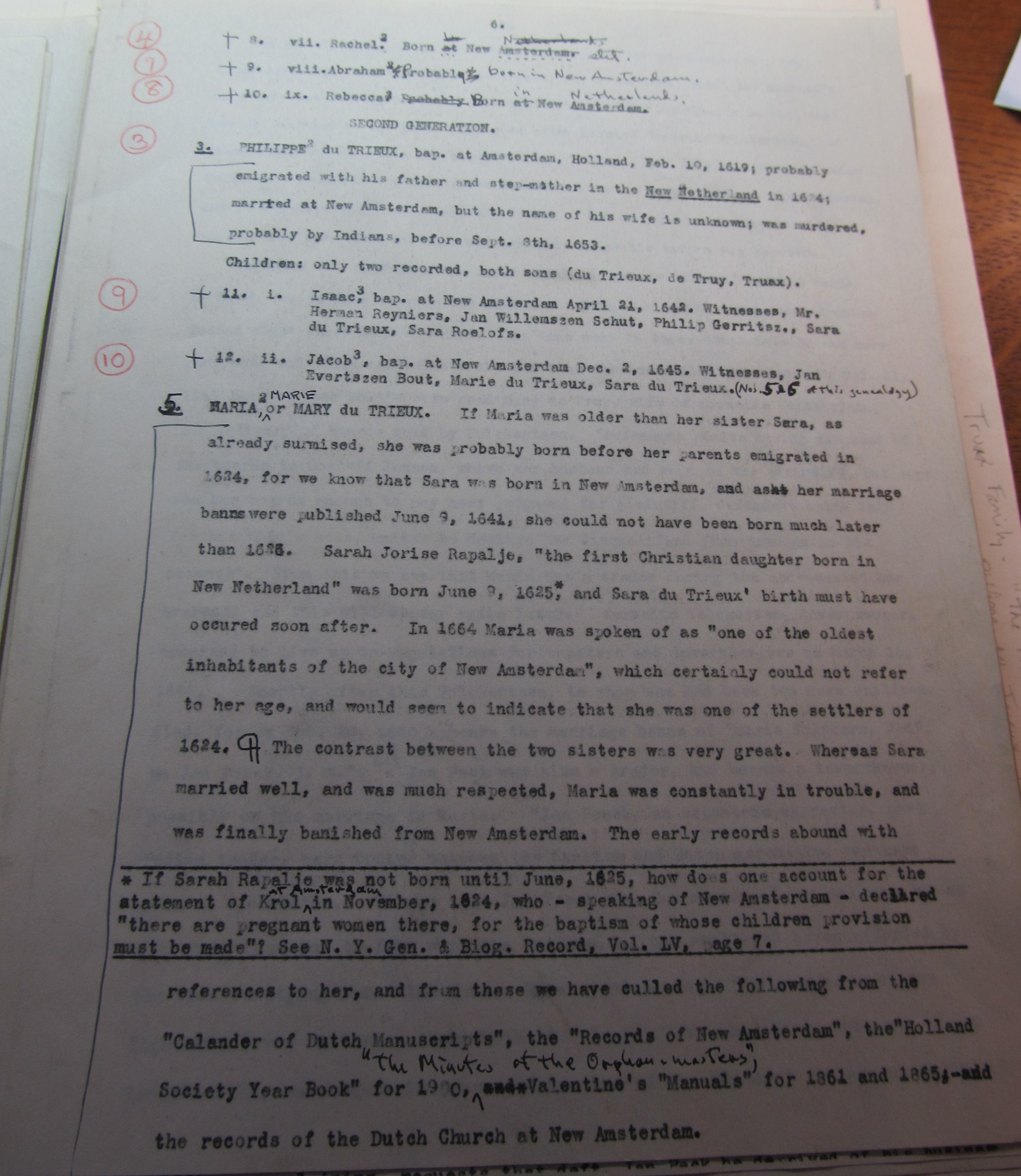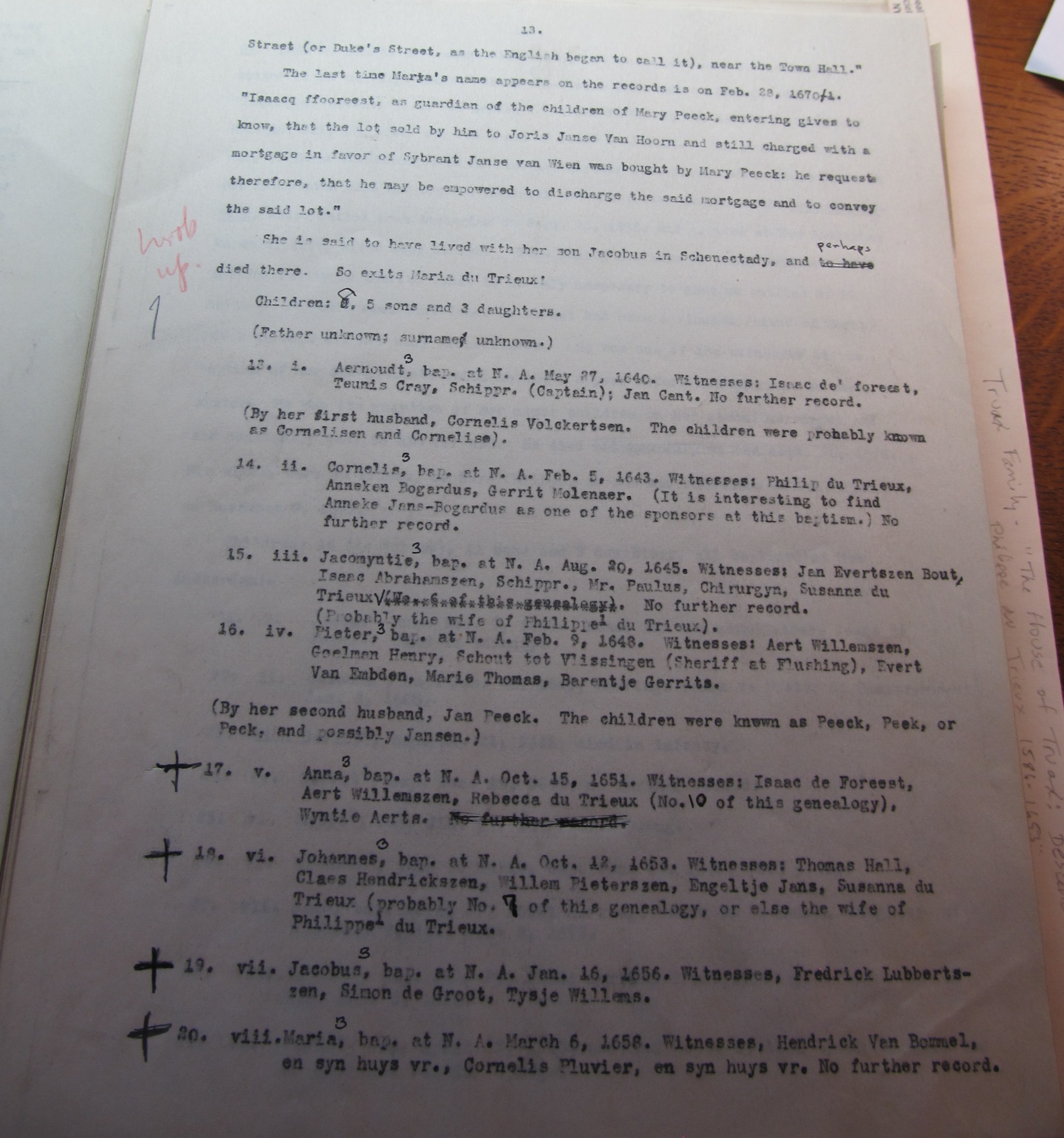 Maria du Trieux (Peek), perhaps an elder sister of Philippe, was the widow of Cornelius Volkertse when she married Jan Peek in New Amsterdam, on the 20th of February 1640. In 1664 she was called “one of the oldest inhabitants of New Amsterdam[“]; as per Prof. Pearson, who further says: